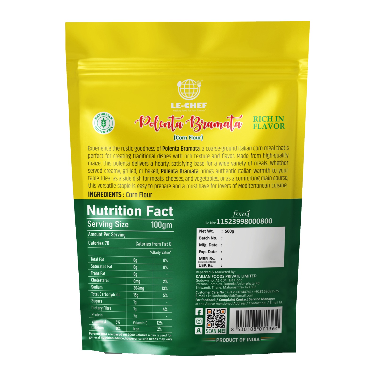 Discover the authentic taste of Italian cuisine with Le-Chef Polenta Bramata, a premium coarse-ground corn flour that brings Mediterranean flavours to your kitchen. This versatile 500g pack of traditional Italian corn meal delivers a hearty, satisfying base for countless culinary creations. Whether served creamy, grilled, or baked, this polenta offers a rich texture and robust flavour that perfectly complements meats, cheeses, and vegetables. Made from high-quality corn, it’s an excellent choice for both side dishes and main courses. Each 100g serving contains just 70 calories, making it a mindful choice for health-conscious food enthusiasts. The convenient resealable packaging ensures the flour stays fresh throughout use. This kitchen staple is remarkably easy to prepare and transforms into a comforting dish that captures the essence of traditional Italian cooking. Perfect for both everyday meals and special occasions when you want to create an impressive Mediterranean feast.