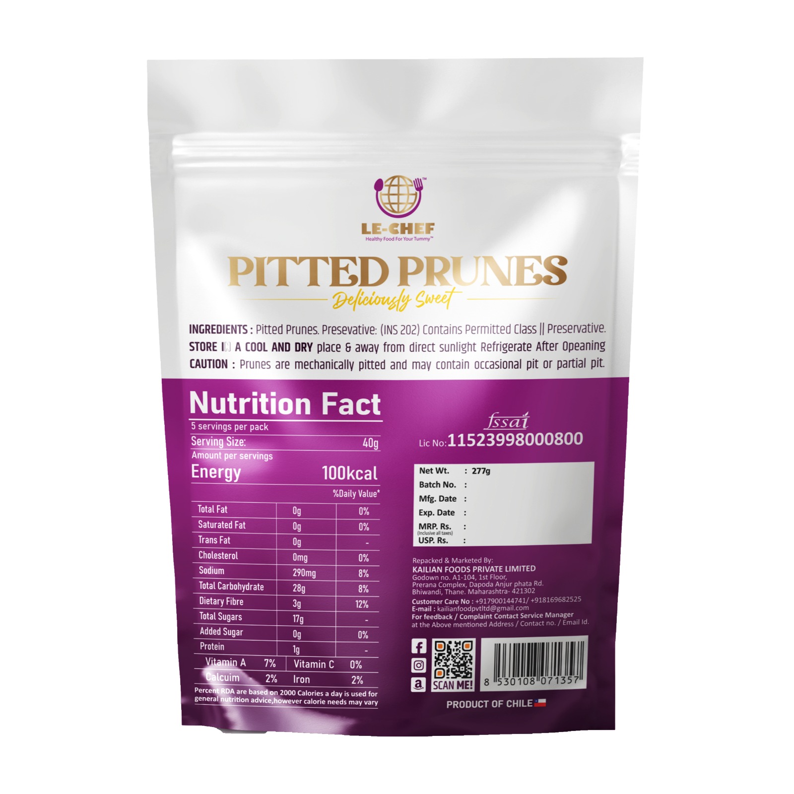 • Naturally Sweet & Juicy: Le Chef Pitted Prunes are made from premium, sun-dried plums, carefully pitted to deliver a rich, naturally sweet flavor and soft, chewy texture.